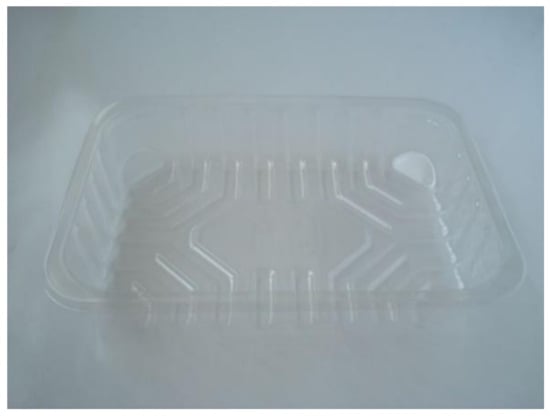 Once the sheet is produced, it is taken to the thermoforming process were the final nanocomposite trays are formed. The thermoforming machine is a KIEFEL GmbH (Sudetenstraße, Freilassing, Germany). The tray chosen was a B1825-45, which is 18 cm wide, 25 cm long and 45 mm deep (Figure 2). This is one of the most used trays for MAP of food products.