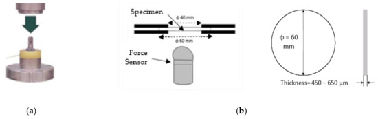 These impact tests were done in an MTS-831 instrumented equipment (Eden Prairie, MN, USA), following ISO 6603-2:2000 [22] methodology. The speed used was 4.4 m/s and tests were done at room temperature (23 °C). In Figure 3, it can be seen the scheme of the impact instrument and the way the specimen is hold for the impactor to hit it.