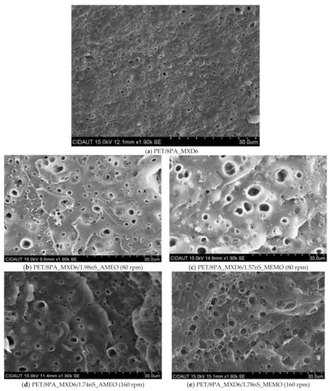 SEM results show good PA_MXD6 dispersion into PET matrix, which could be attributed to the hydrogen bonding interactions between them [24]. This dispersion is slightly better PA_MXD6 particle size and distribution for samples AMEO modified than those modified MEMO. At the same time, that particle size is independent of the processing speed when using AMEO silane (Figure 4b,d), but it seems to be worse at 80 rpm when using MEMO. On the other hand, particle sizes are quite heterogeneous compared to a PET/8PA_MXD6 sample (control) (Figure 4a). Thus, nanosepiolite causes the appearance of different particle sizes populations.