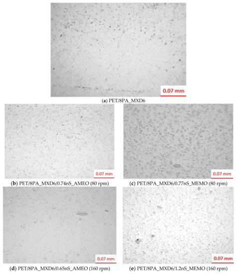 Optical microscopy characterization has shown micrometric sepiolite aggregates with heterogeneous shapes and sizes in all the samples (Figure 8). The maximum size being close to 30 µm. Moreover, as it was seen at laboratory scale, it is possible to distinguish PA_MXD6 particles as little dots within the PET matrix, and PA_MXD6/nS as bigger an irregular shape. Sepiolite dispersion seems to be worse in industrial extruder, since the materials produced show higher number of aggregates.