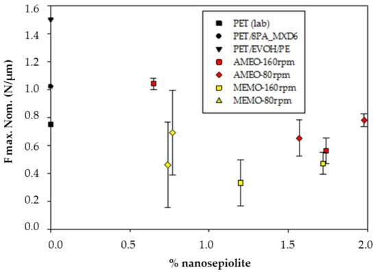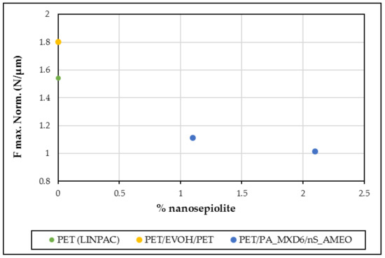 PET/PA_MXD6/nS nanocomposites Normalized Maximum Force as a function of nanosepiolite content.