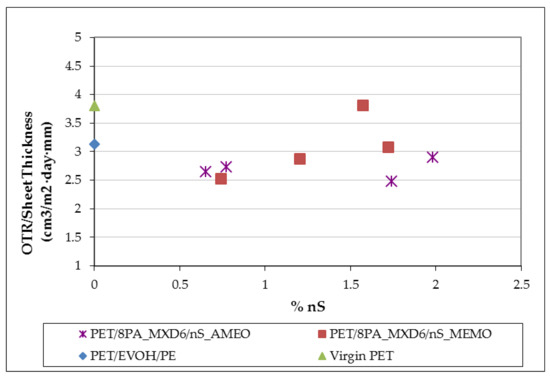 All the samples produced with AMEO modified sepiolite have shown an improvement in oxygen transmission rate (OTR) against the reference samples, that is PET and PET/EVOH/PE sheets. This is due to the tortuous path formed by the nanoclay particles, that makes the travel through the polymer matrix, more difficult to the permeant. This improvement goes from 21% to 33% against Virgin PET, and from 9% to 22% against PET/EVOH/PE laminated sheet. However, samples modified with MEMO show poorer results in nearly all the samples. This could be due to matrix degradation [29], which causes higher permeability values. Degradation of the polymer means its molecular chains are broken, generating more free volume for the permeants. In the following figure (Figure 7), it is not shown permeability as a function of extrusion speed because it has been seen that the results are independent from this factor, and it only added confusion to the graph. When using MEMO, the tendency shows an increase in permeability when increasing nanosepiolite content, which could be due to aggregation of the clay containing particles, together with the degradation of the PET matrix. However, those nanocomposites AMEO modified keep permeability values quite constant from 0.5% nS to 2% nS. This could be due to the stability of the samples through all the production process when using this modifier. In this work, samples with sepiolite content over 2% were not produced, due to previous experiences, where it has been observed that processability of nanocomposites is much more difficult when increasing the nanoclay content [12,29].
