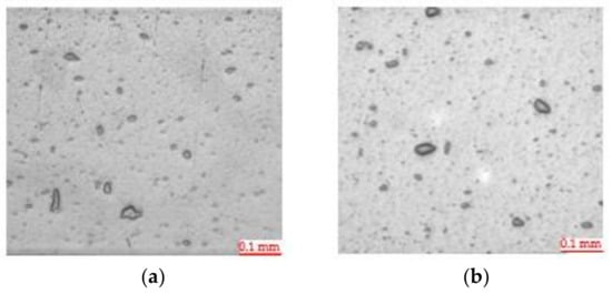 Optical microscopy of sheet samples (a) PET/PA_MXD6/nS_AMEO 1.1% nS, and (b) PET/PA_MXD6/nS_AMEO 2.1% nS.