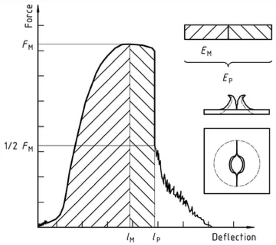 These tests are done on the industrially extruded sheet, before the thermoforming process. Registered curves for impact tests show a maximum which is related to the initial damage on the sheet, corresponding to the starting point of the fissure that will develop in a fracture. Analyzing the curves obtained in this test, maximum load, and its associated deformation can be known, as well as perforation energy. In Figure 9, it is shown an example of the force-deflection diagram obtained.