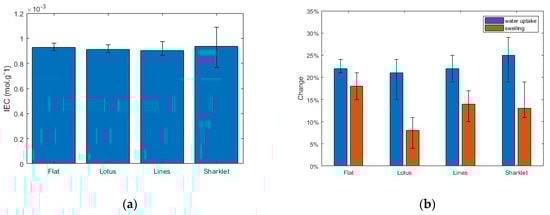 Figure 2. (a) Ion exchange capacity, (b) water uptake, and swelling ratio for the patterned membranes.