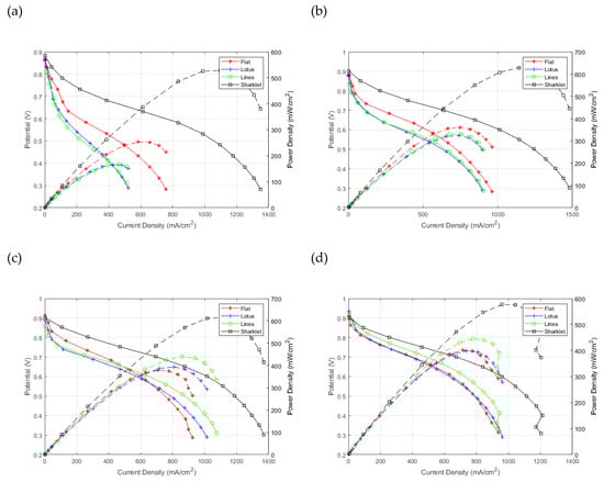 Figure 3. Fuel cell performance for the different membrane patterns at different hydration levels for (a) 25%, (b) 50%, (c) 75%, (d) 100%.