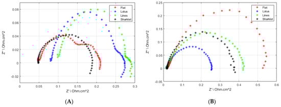 Furthermore, EIS analysis was conducted on the MEAs to gain further insight into the performance shown in the polarisation curves. Figure 4A,B shows the EIS results measured at 0.4 V for 25% and 100% relative humidity for the tested samples. The results show the superior properties of the sharklet membrane in terms of low high-frequency resistance (HFR) and mass transport at both relative humidity levels. Generally, HFR increases as RH drops due to the reduction in proton conductivity across the membrane. Le Canut J. et al. [26] showed that shape changes in the impedance spectra could be attributed to drying. All the samples showed a spectral shape change from 100% to 25%, aside from the sharklet pattern, implying it did not dry out as much as the others.