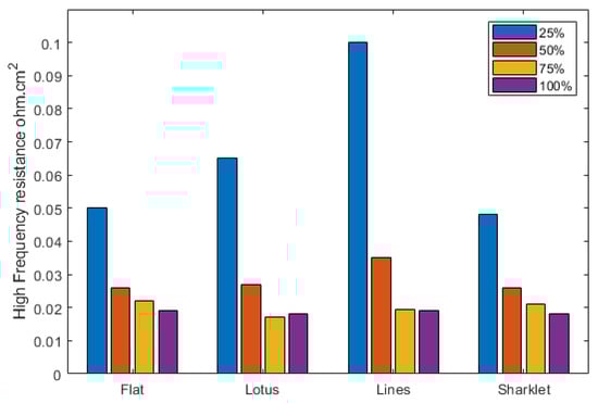 Figure 5. High-frequency resistance across the different humidity levels for each pattern.