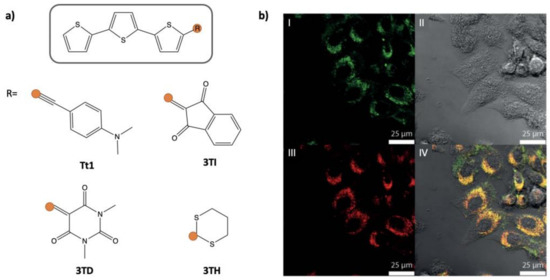 - DiMaria, F.; Barbarella, G. Facilitated synthesis of functional oligothiophenes for application in thin film devices and live cell imaging. J. Sulfur Chem. 2013, 34, 627–637. [Google Scholar] [CrossRef]