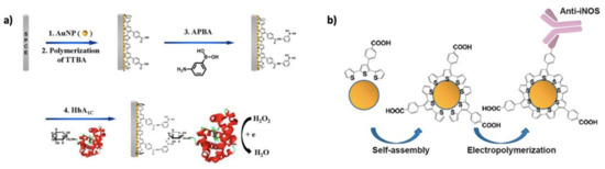 - Koh, W.-C.A.; Chandra, P.; Kim, D.-M.; Shim, Y.-B. Electropolymerized Self-Assembled Layer on Gold Nanoparticles: Detection of Inducible Nitric Oxide Synthase in Neuronal Cell Culture. Anal. Chem. 2011, 83, 6177–6183. [Google Scholar] [CrossRef] [PubMed]