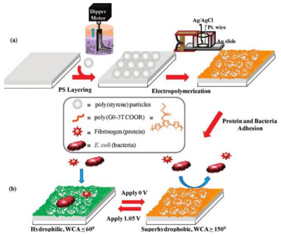- Pernites, R.B.; Santos, C.M.; Maldonado, M.; Ponnapati, R.R.; Rodrigues, D.F.; Advincula, R.C. Tunable Protein and Bacterial Cell Adsorption on Colloidally Templated Superhydrophobic Polythiophene Films. Chem. Mater. 2012, 24, 870–880. [Google Scholar] [CrossRef]