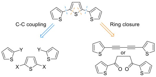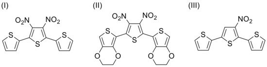 - Steinkopf, W.; Leitsmann, R.; Hofmann, K.H. Studien in der Thiophenreihe. LVII. Über α-Polythienyle. Justus Liebig’s Ann. Chem. 1941, 546, 180–199. [Google Scholar] [CrossRef]