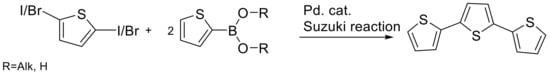 - Melucci, M.; Barbarella, G.; Sotgiu, G. Solvent-Free, Microwave-Assisted Synthesis of Thiophene Oligomers via Suzuki Coupling. J. Org. Chem. 2002, 67, 8877–8884. [Google Scholar] [CrossRef] [PubMed]