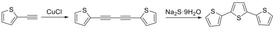 - Kagan, J.; Perrine, M.D. A Side Reaction in the Synthesis of 2-Ethynylthiophene from 2-Thiophenecarboxaldehyde by the Corey Procedure and an Inproved Synthesis of 2,2′:5′,2″-Terthiophene. Heterocycles 1986, 24, 365. [Google Scholar] [CrossRef]