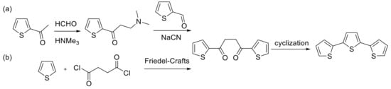 - Merz, A.; Ellinger, F. Convenient Synthesis of α-Terthienyl and α-Quinquethienyl via a Friedel-Crafts Route. Synthesis (Stuttgart) 1991, 1991, 462–464. [Google Scholar] [CrossRef]