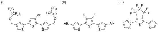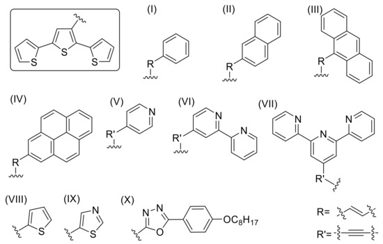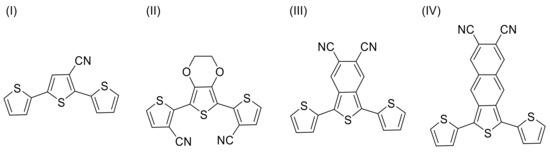 - Buerle, P.; Becher, J.; Lau, J.; Mark, P. Sulfur-Containing Oligomers. In Electronic Materials: The Oligomer Approach; Wiley-VCH Verlag GmbH: Weinheim, Germany, 1998; pp. 105–233. [Google Scholar]
