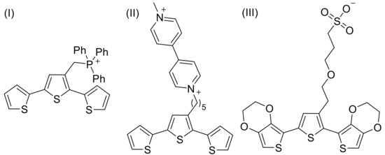 - Bäuerle, P.; Gaudl, K.U. New functionalized polythiophenes. Synth. Met. 1991, 43, 3037–3042. [Google Scholar] [CrossRef]