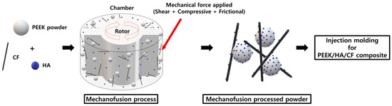 A schematic of mechanofusion process to prepare the PEEK/HA/CF composite.