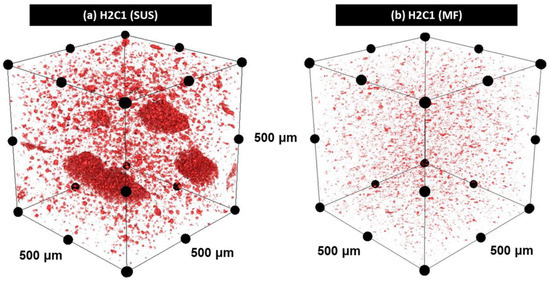 Three-dimensional X-ray micro-CT analysis on H2C1 composites made by (a) SUS and (b) MF.