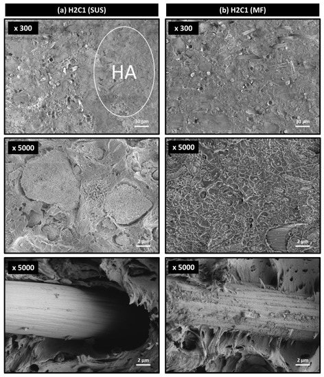 The fractured sections of H2C1 composite after flexural testing were observed to investigate the dispersibility of the HA filler. As shown in Figure 4, the fracture morphologies of both composites were changed from ductile to brittle failure due to HA and CF fillers. It can be seen that the main fracture mechanism occurred by aggregation of HA fillers. It was important to note that severely aggregated HA fillers were easily observed in the H2C1 composite made by the SUS method (Figure 4a), whereas the HA fillers in the H2C1 composite made by the MF method were dispersed better with a size of about 1 μm (Figure 4b). The poor interfacial interaction between HA and PEEK matrix was another reason for early failure of composites. In both H2C1 composites, the majority of the HA particles showed adhesive failure due to interfacial de-bonding with the PEEK matrix.