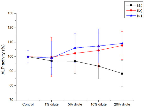 To evaluate the cell compatibility of the composites, every composite was extracted for 24 h at 36.5 °C with DMEM medium. The extracted composite solution was diluted to various concentrations (1, 5, 10 and 20%). The HOB cells were seeded in each well (1.0 × 104 cells/well) of 96-well cell culture plates (TCPS). An amount of 100 µL of ALP solution containing pNPP (p-nitrophenyl phosphate) was added to each well. Subsequently, the cells were cultivated for 1 h at 36.5 °C in 5% CO2 condition and 50 µL of stop solution in ALP assay kit was added into each well. To determine the cell activity, the ultraviolet-visible (UV-Vis) absorbance of the solutions in each well was measured at 405 nm using a Varioskan LUX multimode microplate reader (Thermo Fisher Scientific, Waltham, MA, USA).