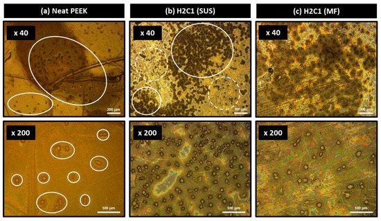 Table 3 showed the compressive strength data of PEEK composites. Similar to the flexural properties in C1, C2, and C3 samples, the compressive strength and modulus were also increased with the addition of CF filler. However, there was no significant change in the flexural properties between the C1, C2, and C3 composites prepared by SUS or MF method. After the incorporation of the HA filler, the compressive strength was improved by both methods. Among various bioactive ceramics, HA, which has low porosity and dense structure, could increase compressive strength with increasing content [47]. The composites prepared by the MF method showed higher compressive strength than the ones prepared by the SUS method because of the enhanced pulverization and dispersibility of the HA nanofiller. The compressive strength of H2C1 sample made by the MF method found to be in the middle range of cortical bone (i.e., 106–215 MPa) [48] and could be further improved with the addition of CF filler.