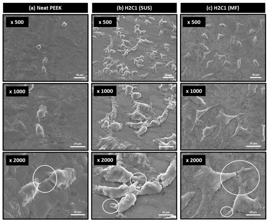 For the application as bone cage materials, osteo-compatible HA should be well-dispersed on the surface of the composite. The HOB cell adhesion behavior of neat PEEK and H2C1 composites was determined by optical microscope and SEM. In Figure 6, the HOB cells were attached well on the surfaces of H2C1 composites (Figure 6b,c) compared to the neat PEEK (Figure 6a). Furthermore, the HOB cells on the surface of H2C1 composite made by the MF method were more finely dispersed than SUS method. These results indicated that the MF method is more suitable for dispersing HA particles than the SUS method. Figure 7 showed the morphologies of HOB cells that were attached to the surface of PEEK composites by SEM. In the stage of cell adhesion, cells form filopodia and lamellipodia on the surface. Filopodia and lamellipodia are important to determine the attached cell migration [53,54]. The cells on the neat PEEK (Figure 7a) were small and round, whereas the cells on the H2C1 composites were well spread out (Figure 7b,c). But, the HOB cells on the H2C1 composite made by SUS were aggregated. The cells attached to the H2C1 composites exhibited pseudopodia extension with filopodia and lamellipodia. Based on these results, the MF method was expected to be better method for bone cage application than the SUS method due to the enhanced dispersibility of the HA particles.
