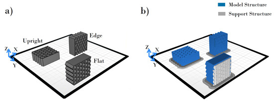 The assumptions underlying the test specimens depended on the variation of two preprocessing parameters with three levels, namely, infill density (30%, 70%, and 100%) and printing orientation of the model (edge, flat, and upright), which were considered controlling factors. The build direction was modified by changing the orientation of the model and thus the direction of layers (Figure 2).
