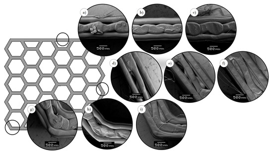 Microscopic characterization of upright printed structure: front superior wall of density at (a) 30%, (b) 70%, and (c) 100%; front lateral wall at (d) 30%, (e) 70%, and (f) 100%; front corner wall at (g) 30%, (h) 70%, and (i) 100%.