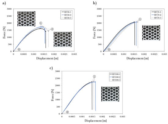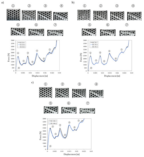 The following figures (Figure 5, Figure 6, Figure 7 and Figure 8) show the behavior of the PET-G honeycomb structures during the compression tests. The figures depict the sequence of deformed configuration and the recorded load–displacement response from the three samples of each specimen. The tests ended automatically by the machine after detecting a break with a high rate of load fall or ended by the user after the densification region was reached. Previous studies show two types of fractures: ductile and brittle. The main characterization of ductile fracture is the presence of large plastic deformations that occur before and/or during the fracture process; in brittle fracture, there is a small amount of inelastic deformation [42]. In engineering applications, ductile fracture is less damaging because it occurs over a period of time, whereas brittle fracture is fast, unpredictable, and often catastrophic.