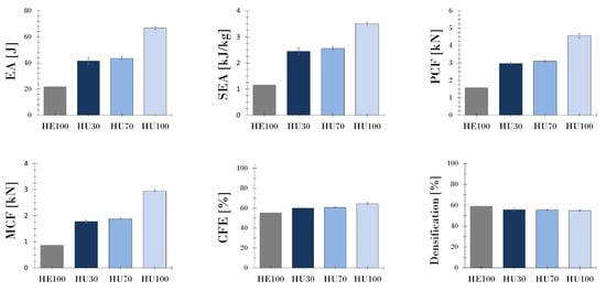 The crashworthiness indicators are obtained by identifying the area under the plateau region curve of the performed compression tests that presented a plateau region, by referring to the densification phase, and by using Equations (1)–(5). These indicators are summarized in Table 5.