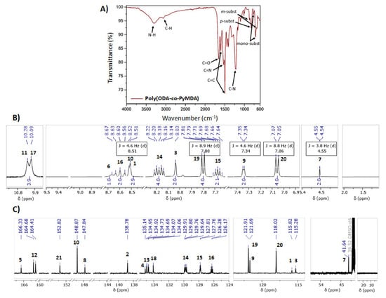 The chemical structure of poly(ODA-co-PyMDA) was corroborated by means of FT-IR, 1H, and 13C-NMR, whose results are shown in Figure 2.