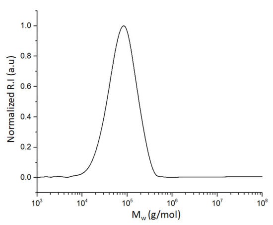 From FT-IR analysis (Figure 2A), the presence of typical signals ascribed to the expected functional groups in the polymer can be identified. Within them, those corresponding to N−H and C=O structures allow the identification of amide linkages coming from the polymerization process but also from the PyMDA monomer. Both signals can be found centered at 3296 and 1656 cm−1, respectively. In addition, the aromatic structure of poly(ODA-co-PyMDA) can be confirmed by the presence of two vibrational bands at 1600 and 1494 cm−1, which has been previously assigned to C=C but also to a series of less intense signals detected in the range between 1000 and 600 cm−1. These last signals have been correlated to vibrational modes arising from meta and para-substituted benzene rings. Finally, signals referred to C=N and C−N bonds can be observed at 1534 and 1233 cm−1, respectively, where the first one would demonstrate the presence of pyridinyl pendant groups. On the other hand, Figure 2B,C exhibit a complete and successful signal assignment for the most relevant protons and carbons, corroborating the correct structure of the obtained polymer. This assignment was carried out by using as reference the NMR spectra recorded for poly(PyMDA) and poly(ODA), which are both attached in the Supporting Information File (Figures S2 and S3). Concerning the signals assignment, the 1H-NMR analysis allowed the identification of two signals between 11 and 10 ppm. The signal at 10.1 ppm (17) would be assigned to protons belonging to amides prepared from ODA units, while the signal at 10.3 ppm (11) should be ascribed to protons present in amide structures containing PyMDA moieties. Another important signal is the one observed at 4.5 ppm (7), representing the methylene unit present in the PyMDA structure. Lastly, high-intensity signals (doublets) labeled as 19 and 20 have been related to protons from the ODA structure. Therefore, both ODA and PyMDA structures were confirmed in the polymer backbone. Indeed, based on the integral analysis of the respective proton signals, it is shown that the ODA:PyMDA ratio present in the polymer correlates well with the initial monomer feed ratio employed during the polymerization. Based on the above, the correct chemical structure of poly(ODA-co-PyMDA) was confirmed. Finally, in order to confirm the macromolecular nature of poly(ODA-co-PyMDA), its weight-average molecular weight (Mw), number-average molecular weight (Mn), and dispersity (Đ) were determined by SEC analysis (Figure 3). The results are summarized in Table 1.
