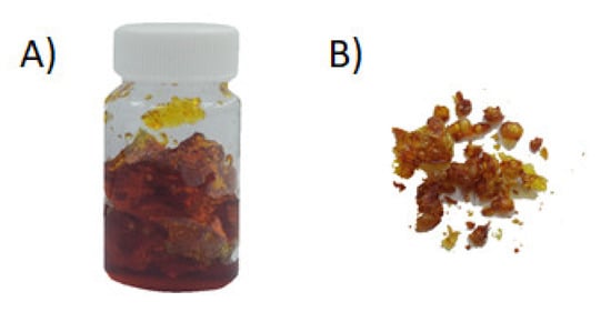 Examples of insoluble gels obtained during alkylation of poly(ODA-co-PyMDA) with butyl and hexyl iodide (A) and gels dried at 150 °C (B).