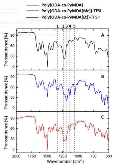 FT-IR spectra of poly(ODA-co-PyMDA) (A), Poly(ODA-co-PyMDA[Me])-TFSI− (B) and poly(ODA-co-PyMDA[Et])-TFSI− (C).