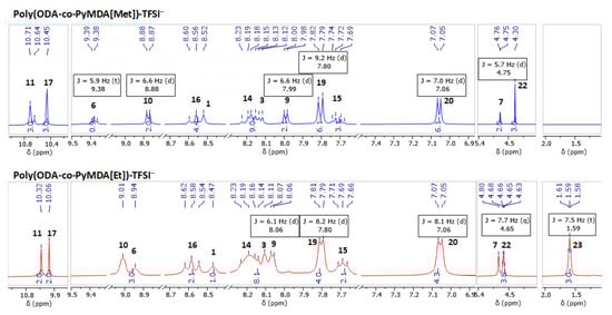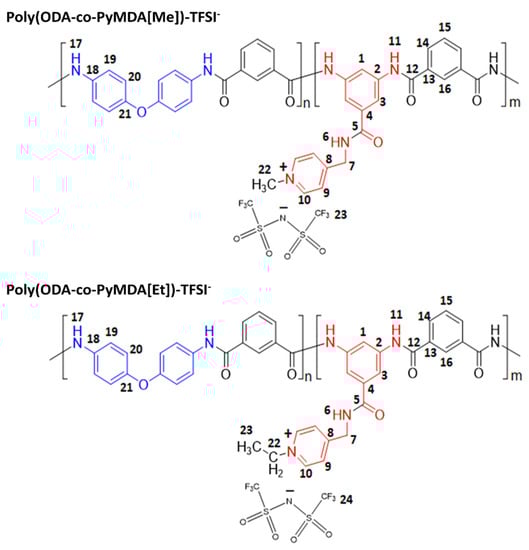 The above table reveals a remarkably similar result in terms of solubility for all obtained samples, showing as the main difference the behavior exhibited by both polyelectrolytes against NMP. It is well-known that polyamides usually exhibit low solubility, due to the presence of strong intermolecular interactions such as hydrogen bonds and π–π stacking. However, all these polymers possess solubility in aprotic polar solvents frequently used in the manufacture and processability of polyamides. On the other hand, it draws attention to the abrupt increase of the viscosity when polyelectrolytes are compared against poly(ODA-co-PyMDA). The above phenomenon has been widely reported for charged polymers [], where the higher viscosities shown by this type of macromolecules have been attributed to the tendency of their polymer chains to adopt more extended conformations in solution. This would be explained by the presence of electrostatic repulsions forces generated between monomeric units with the same charge. Therefore, considering that the molecular weight between the obtained materials is not changed, the increased viscosities values of poly(ODA-co-PyMDA[Me])TFSI− and poly(ODA-co-PyMDA[Et])TFSI− could be indicative of their charged nature.