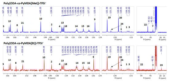 Figure 6 reveals the successful assignment of the most relevant proton signals present in both polyelectrolytes. The assignment and analysis of both spectra were performed using as reference the spectra recorded for poly(ODA-co-PyMDA) (Figure 2B). In this sense, the apparition of new signals and the chemical shifts experienced by others confirm the correct alkylation of the polyamide. In detail, it draws attention to both polyelectrolytes, the noticeable displacement exhibited by signals 6, 9, and 10, along with the apparition of new signals labeled as 22 and 23. The displacement experienced by the first three signals mentioned above could be ascribed to changes in the electronic density of pyridinyl rings after their alkylation, which is mainly due to the inductive effect. On the other hand, the apparition of signals 22 and 23 reveals the presence of methyl and ethyl groups bonded to the quaternized nitrogen. In addition, a similar analysis was carried out to 13C-NMR spectra, allowing the detection and assignment of the most relevant carbon signals of the polyelectrolyte structures (Figure 7). In this regard, important displacements were observed for those carbons belonging to pyridinyl structures, along with the apparition of signals 22 and 23 related to alkylating agents. However, in addition to the above signals, two new signals pointed out by black arrows in Figure 7 and labeled as 24 appear in the spectra of both polyelectrolytes at 121.21 and 118.01 ppm. These signals have been assigned to CF3 structures and, therefore, caused by the presence of TFSI− counterions.