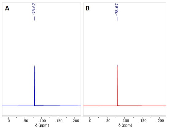 The apparition of carbon signals ascribed to TFSI− counterions served as motivation to record 19F-NMR spectra, successfully demonstrating the presence of these anions in both polyelectrolytes. The results are shown below in Figure 8A,B.
