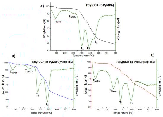 After the alkylation of poly(ODA-co-PyMDA), some relevant changes in the thermal degradation behavior were observed. Figure 9B,C expose TGA curves measured for both polyelectrolytes where, instead of five degradation steps, only four were detected and labeled as Twater, TDMAc, T1, and T2. Similar to poly(ODA-co-PyMDA), the first two steps are attributed to the volatilization of low molecular weight species, which are mainly attributed to solvents. This was again supported by the recording of FT-IR spectra for both polyelectrolytes once they were heated up to 320 °C. It is worth noting that poly(ODA-co-PyMDA[Et])TFSI− possesses a noticeable higher amount of retained solvent, which forced us to expose the three polymers to an extra drying process before continuing with the development of the present work. Regarding T1 in both polyelectrolytes, it can be seen that they occur at a lower temperature in comparison to poly(ODA-co-PyMDA), which would be indicative of pyridinyl groups with a more labile structure once its alkylation is achieved. Finally, the decomposition labeled as T2 in both polyelectrolytes could arise from the merging of the two steps previously labeled as T2 and T3 in poly(ODA-co-PyMDA) and therefore would be related to the decomposition of the polymer backbone. This merging could be originated since, apparently, both degradation steps associated with PyMDA structures shift to lower temperatures.