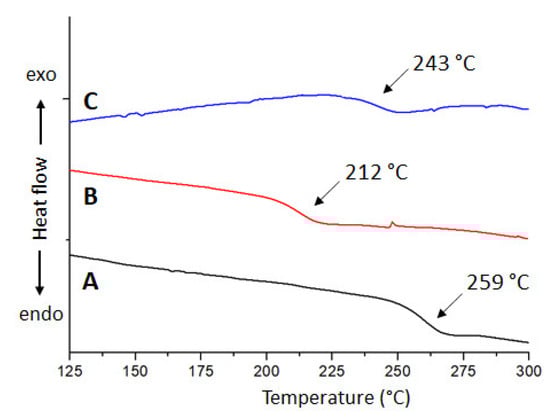 DSC curves of poly(ODA-co-PyMDA) (A), poly(ODA-co-PyMDA[Me])TFSI−, (B) and poly(ODA-co-PyMDA[Et])TFSI− (C).