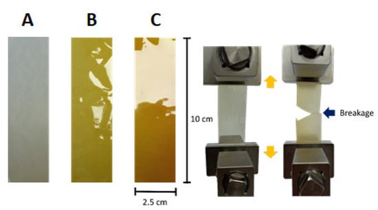 Films obtained from poly(ODA-co-PyMDA) (A), poly(ODA-co-PyMDA[Me])TFSI−, (B) and poly(ODA-co-PyMDA[Et])TFSI− (C). To the right, a representation of the tensile test performed.