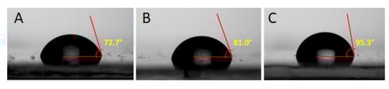 Approaching the study of these materials in water desalination applications, it is essential to examine the behavior of the obtained films against water. To afford this, in a first stage, wettability studies were carried out by contact angle measurements. Figure 12A–C show images of measurements carried out, whose values are summarized in Table 5.