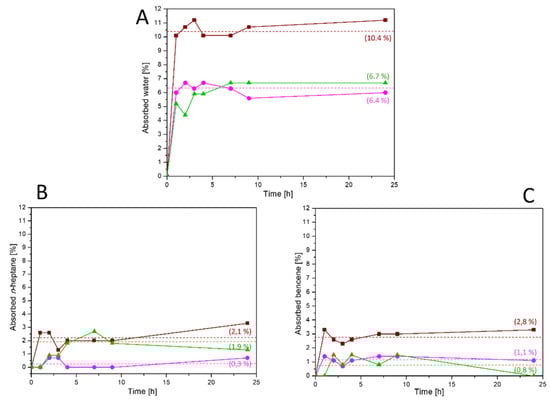 Water (A), n-heptane (B), and benzene (C) absorption curves recorded for poly(ODA-co-PyMDA) (wine), poly(ODA-co-PyMDA[Me])TFSI− (magenta), and poly(ODA-co-PyMDA[Et])TFSI− (green) films.