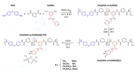 The following are available online at https://www.mdpi.com/article/10.3390/polym13121993/s1, Image S1: Experimental assembly for stage one in the synthesis of 3,5-dinitro-N-(pyridin-4-ylmethyl)benzamide (PyMDN), addition of 3,5-dinitrobenzoyl chloride upon dissolution of pyridin-4-ylmethanoamine (A) and experimental assembly for stage two in the synthesis of PyMDN, heating-agitation and synthesis PyMDA by reduction of PyMDN with Pd/C and hydrazine (B), Image S2: Experimental assembly for the synthesis of polymers (A) and polyelectrolyte (B), Scheme S1: Chemical structure of poly(PyMDA), Scheme S2: Chemical structure of poly(ODA), Scheme S3: Chemical structure of Poly(ODA-co-PyMDA[Bu])-I−, Scheme S4: Chemical structure of Poly(ODA-co-PyMDA[Hex])-I−), Figure S1: FT-IR spectra of poly(PyMDA) (A), poly(PyMDA-co-ODA) (B) and poly(ODA) (C), Figure S2: 1H NMR spectra of poly(PyMDA) (A), poly(PyMDA-co-ODA) (B) and poly(ODA) (C) (400 MHz, DMSO-d6), Figure S3: 13C NMR spectra of poly(PyMDA) (A), poly(PyMDA-co-ODA) (B) and poly(ODA) (C) (400 MHz, DMSO-d6), Figure S4: TGA (A) and DTGA (B) thermograms of poly(PyMDA), poly(PyMDA-co-ODA) and poly(ODA), Figure S5. Comparison of FT-IR spectra of poly(ODA-co-PyMDA) (A), poly (ODA-co-PyMDA [Me]) TFSI− (B) and poly (ODA-co-PyMDA [Et]) TFSI− (C) with its waste (poly(ODA-co-PyMDA) waste (Aw), poly(ODA-co-PyMDA [Me])TFSI− waste, (Bw) and poly(ODA-co-PyMDA [Et])TFSI- waste (Cw)) after heating to 420 and 320 °C, Figure S6. Images of n-heptane drop on poly(ODA-co-PyMDA) (A), poly (ODA-co-PyMDA [Me]) TFSI− (B) and poly (ODA-co-PyMDA [Et]) TFSI− (C), Table S1: Solubility and viscosity values of polyamides, Table S2. Polymers thermal properties.