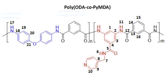 Poly (ODA-co-PyMDA) spectroscopic data. Conversion: 76%. FT-IR-ATR (ZnSe, cm−1): 3296 (N-H); 3064 (C-H arom.); 1656 (C=O); 1600, 1494 (C=C); 1534 (C=N); 1233, 1213 (C-N); 876, 683 (1,3-disubst); 828 (1,4-disubst); 769, 723 (mono-subst.). 1H NMR (DMSO-d6, δ, ppm): 10.3 (s, 2H, 11); 10.1 (s, 2H, 17); 8.67 (s, 1H, 6); 8.52 (s, 1H, 1); 8.03 (s, 2H, 3); 7.34 (d, J = 4.6 Hz, 2H, 9); 8.60 (t, J = 15.7 Hz, 2H, 16); 8.51 (s, 2H, 10); 8.18 (dt, J = 7.3/15.3 Hz, 4H, 14); 7.80 (d, J = 8.9 Hz, 4H, 19); 7.68 (p, J = 7.6 Hz, 2H, 15); 7.06 (d, J = 8.8 Hz, 4H, 20); 4.55 (d, 3.8, 2H, 7). 13C NMR (DMSO-d6, δ, ppm): 166.3 (5); 164.7/164.4 (12); 152.8 (21); 148.9 (10); 147.8 (8); 138.8 (2); 135.1 (4); 135.0/134.9/134.7/134.7 (13); 134.1/134.0 (18); 129.9/129.8/129.7/129.6 (16); 127.9/127.8/127.7 (15); 126.4/126.3/126.2 (14); 121.9 (19); 121.7 (9); 118.0 (20); 115.8 (1); 115.3 (3), 41.6 (7).