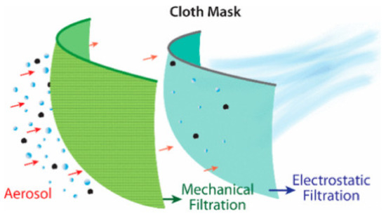 A study of 44 samples of household materials and several medical masks using ambient aerosol particles (30 to 100 nm) at low face velocity has found negligible contributions to small particle deposition by electrostatic attraction [77]. FFR is composed of multiple layers with a central layer of synthetic polymer fibers, such as polypropylene, polybutylene terephthalate, and polytetrafluoroethylene, that is electrostatically charged by corona discharge, triboelectrification or electrostatic spinning [87]. For example, N95 masks consist of multiple layers with some electrostatic charges PP layers that significantly contribute to their FE [88]. Therefore, PP, polyethylene, and polyacrylonitrile (PAN) offer sufficient dielectric properties with high electrical resistance and stability for aerosol particle filtration [35]. In addition, for masks fabricated using melt-blowing technique, charges were embraced within the fabric material layers creating a quasi-permanent electric field for adequate filtration. Particles with opposite charges were attracted to these layers by long-rage electrostatic Coulomb force towards the electrocharged layer [81]. As particles get collected on the filter, they remain in place via Van der Waals’ forces [1,89]. Some industrial oils can reduce the electrostatic charge of filters, thus reducing their FE [90]; however, PP and polystyrene (PS) can resist the shielding effect of oil aerosols [81]. The FE of home-made masks made from one layer of tissue paper and two layers of kitchen towels were tested to filter nano sized NaCl aerosols, as depicted in Figure 1.