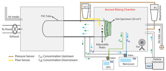 Illustration of filtration efficiency test setup using aerosolized NaCl. Reprinted with permission from [71]. Copyright © 2020 American Chemical Society.