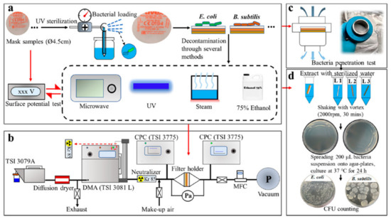 A schematic showing (a) various setups for decontamination and regeneration, (b) setup for particle filtration efficiency test post decontamination, (c) bacteria penetration test setup, and (d) colony unit counting post bacteria filtration. Reprinted with permission from [136]. Copyright © 2020 American Chemical Society.