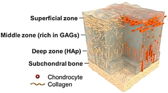 The AC structure is complex, as the compositions of GAGs, chondrocytes and collagen are in random orientations and densities; with the main components of this composition contains water (60–85%), collagen type II (15–22%) and Proteoglycan (PG) (4–7%) [7]. Its deep zone includes hydroxyapatite (Hap) combined with collagen and chondrocyte in the vertical orientation [8], as illustrated in Figure 1. AC is a biphasic substrate categorized as a nonlinear, anisotropic, viscoelastic and inhomogeneous material [7,9].