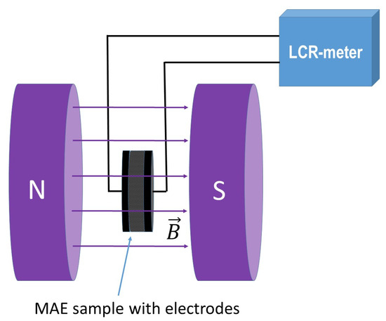 The dependence of the MAE sample capacity on the magnetic field was measured at room temperature using an Agilent E4980A LCR meter, placing the samples between the poles of an electromagnet included in the LakeShore 7407 Hall effect system (Lake Shore Cryotronics Inc., Westerville, OH, USA). The magnetic field was monitored with a vibrating magnetometer with an accuracy of ±0.01 mT. The direction of the magnetic field was perpendicular to the sample surface (see Figure 1).